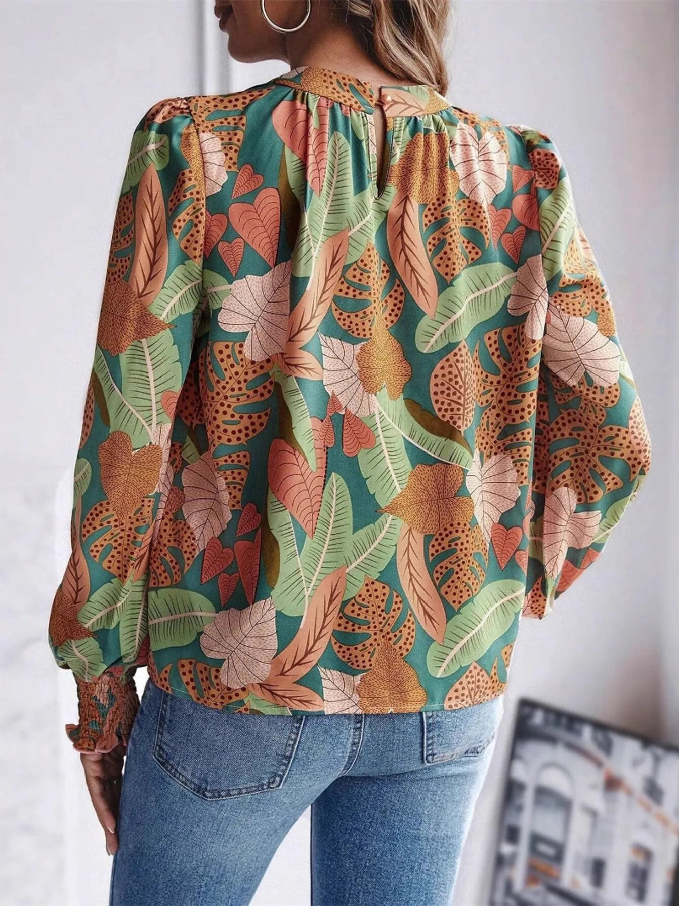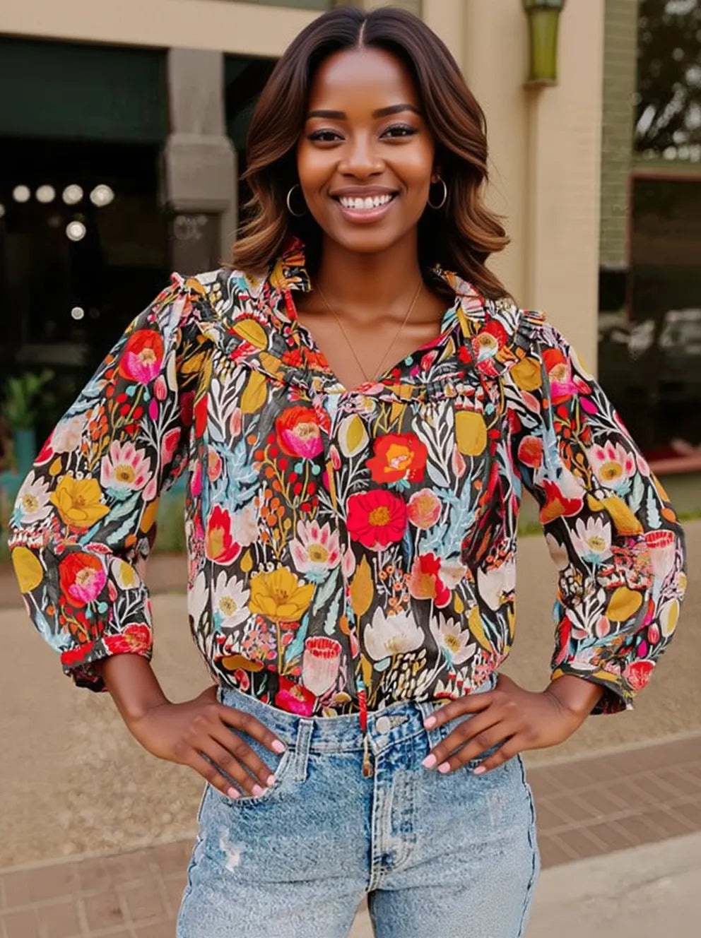 Floral 3/4 Puff Sleeve Tied Neck Blouse -