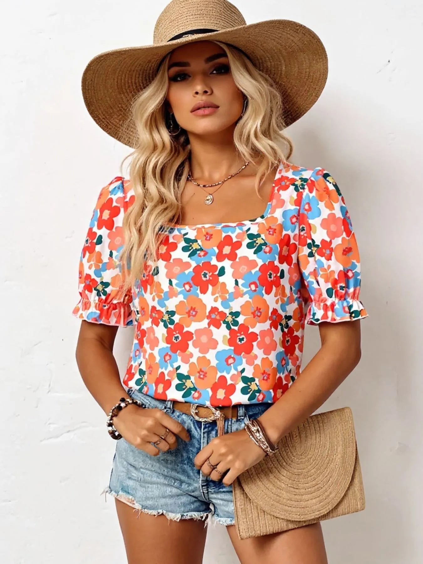 Floral Print Square Neck Puff Sleeve Blouse -